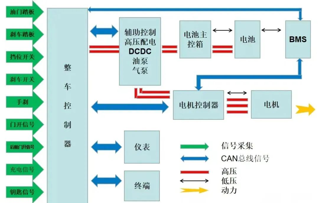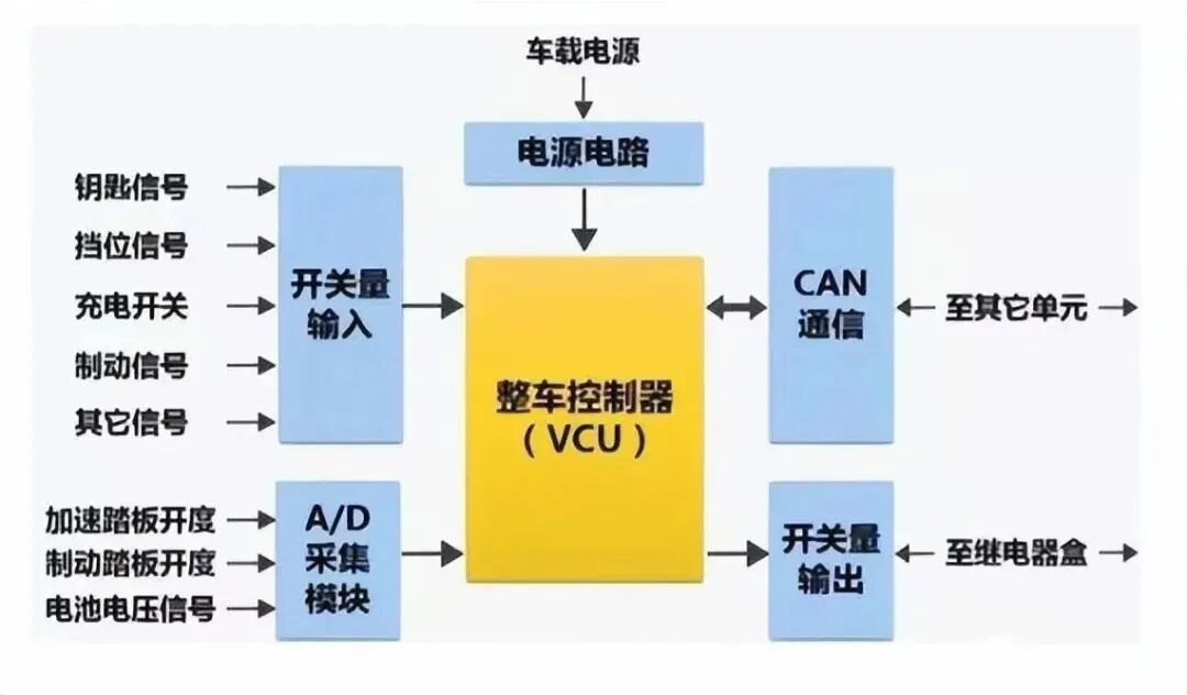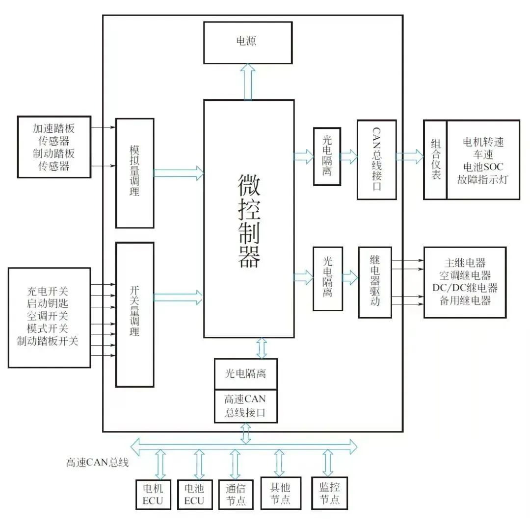 整车控制器能采集加速踏板位置信号、制动踏板信号及其他部件信号并进行相应判断,控制下层各部件控制单元动作,进而实现相应功能。同时, 整车控制器还能通过 CAN总线 对整车运行状态进行管理和调度。