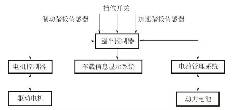 集中式控制系统的基本思想是整车控制器独自完成对输入信号的采集,并根据控制策略对数据进行分析和处理,然后直接对各执行机构发出控制指令,驱动纯电动汽车的正常行驶。