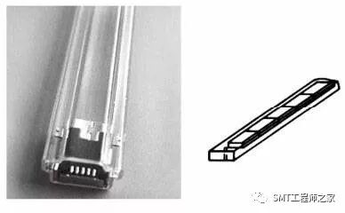 包装管(也称料条)由透明或半透明的聚乙烯(PVC,Polyvinylchloride)材料构成,挤压成满足要求的标准外形,如图3所示。管式包装的每管零件数从数十颗到近百颗不等,管中组件方向具有一致性,不可装反。