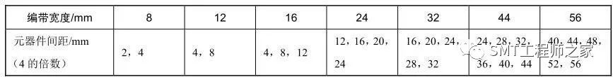 纸编带和塑料编带的一边有一排定位孔,用于贴片机在拾取元器件时引导编带前进并定位。定位孔的孔距为4 mm(小于0402系列的元件的编带孔距为2 mm)。在编带上的元器件间距依元器件的长度而定,一般为4 mm的倍数。编带的尺寸标准见表1。