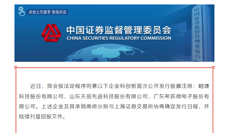 12月14日,证监会按法定程序同意以下企业科创板首次公开发行股票注册:翱捷科技股份有限公司(以下简称“翱捷科技”)、山东天岳先进科技股份有限公司(以下简称“天岳先进”)、广东希荻微电子股份有限公司(以下简称“希荻微”)。上述企业及其承销商将分别与上海证券交易所协商确定发行日程,并陆续刊登招股文件。