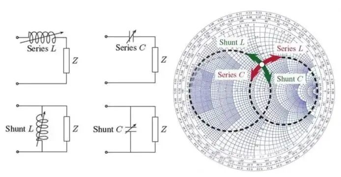 在负载之前串联或并联一个可变电感/电容,电路图如下图左侧4个图所示,将得到Smith圆图上右侧的几条曲线。