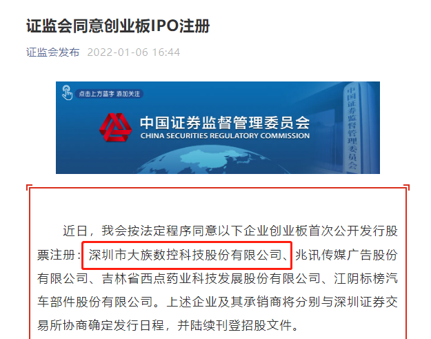 1月6日,证监会官微发布消息称,证监会按法定程序同意深圳市大族数控科技股份有限公司(以下简称“大族数控”)创业板首次公开发行股票注册,大族数控及其承销商将分别与深圳证券交易所协商确定发行日程,并陆续刊登招股文件。
