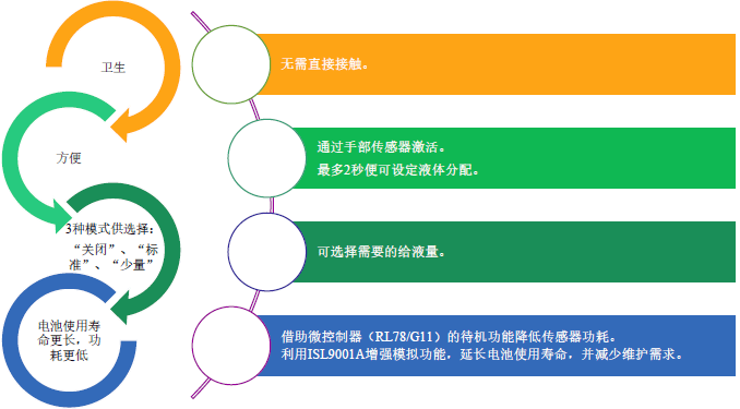 瑞萨电子展示采用 RL78/G11 微控制器的自动感应皂液器快速解决方案。该解决方案利用内置的红外传感器和泵电机来检测手的存在,并分配一定量的液体,如洗洁精、洗手液、洗发水或护手霜。